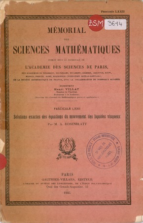 Rosenblatt, A. Solutions exactes des équations du mouvement des liquides visqueux. Mémorial des sciences mathématiques, no. 72 (1935), 72 p. https://www.numdam.org/item/MSM_1935__72__1_0/