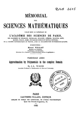 Walsh, J. L. Approximation by polynomials in the complex domain. Mémorial des sciences mathématiques, no. 73 (1935), 76 p. https://www.numdam.org/item/MSM_1935__73__1_0/