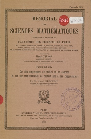 Charrueau, André. Sur des congruences de droites ou de courbes et sur une transformation de contact liée à ces congruences. Mémorial des sciences mathématiques, no. 115 (1950), 76 p. https://www.numdam.org/item/MSM_1950__115__1_0/