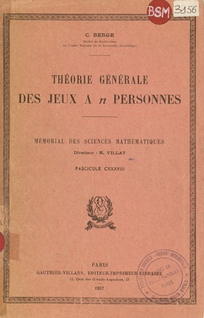 Berge, Claude. Théorie générale des jeux à $n$ personnes. Mémorial des sciences mathématiques, no. 138 (1957), 120 p. https://www.numdam.org/item/MSM_1957__138__1_0/