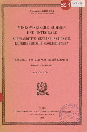 Dinghas, Alexander. Minkowskische Summen und Integrale superadditive Mengenfunktionale isoperimetrische Ungleichungen. Mémorial des sciences mathématiques, no. 149 (1961), 104 p. https://www.numdam.org/item/MSM_1961__149__3_0/