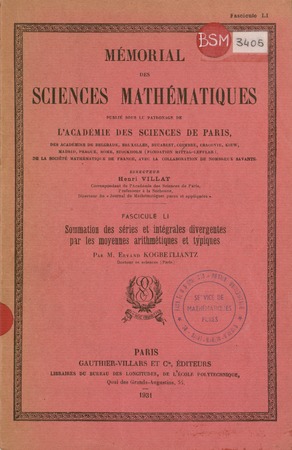 Kogbetliantz, Ervand. Sommation des séries et intégrales divergentes par les moyennes arithmétiques et typiques. Mémorial des sciences mathématiques, no. 51 (1931), 92 p. https://www.numdam.org/item/MSM_1931__51__1_0/