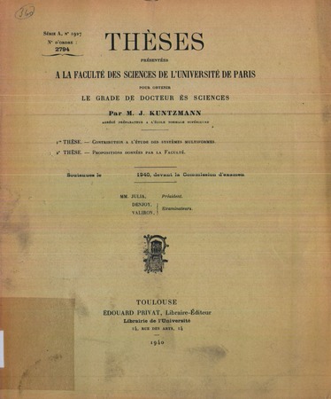 Kuntzmann, J. Contribution à l'étude des systèmes multiformes. Thèses de l'entre-deux-guerres, no. 231 (1940), 50 p. https://www.numdam.org/item/THESE_1940__231__1_0/