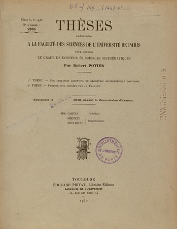 Potier, Robert. Sur certaines questions de géométrie différentielle conforme. Thèses de l'entre-deux-guerres, no. 235 (1940), 70 p. https://www.numdam.org/item/THESE_1940__235__1_0/