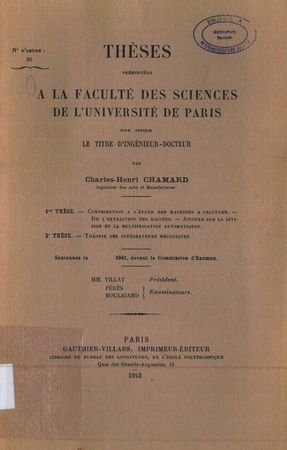 Chamard, Charles-Henri. Contribution à l'étude des machines à calculer. De l'extraction des racines. Annexe sur la division et la multiplication automatiques. Thèses de l'entre-deux-guerres, no. 247 (1942), 70 p. https://www.numdam.org/item/THESE_1942__247__1_0/