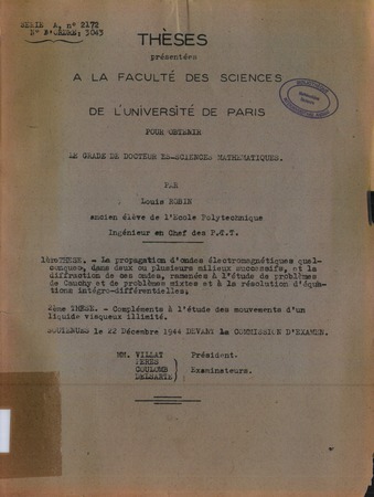 Robin, Louis. La propagation d'ondes électromagnétiques quelconques, dans deux ou plusieurs milieux successifs, et la diffraction de ces ondes, ramenées à l'étude de problèmes de Cauchy et de problèmes mixtes et à la résolution d'équations intégro-différentielles. Thèses de l'entre-deux-guerres, no. 269 (1944), 174 p. https://www.numdam.org/item/THESE_1944__269__1_0/
