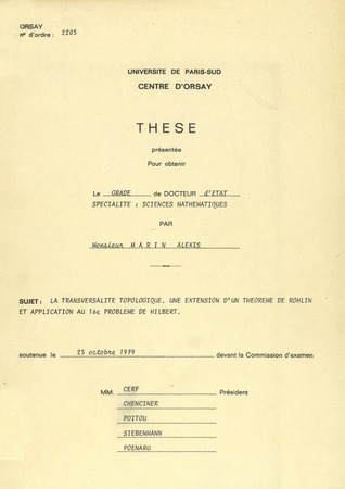 Marin, Alexis. La transversalité topologique : une extension d'un théorème de Rohlin et application au 16e problème de Hilbert. Thèses d'Orsay, no. 82 (1979), 67 p. https://www.numdam.org/item/BJHTUP11_1979__0082__P0_0/