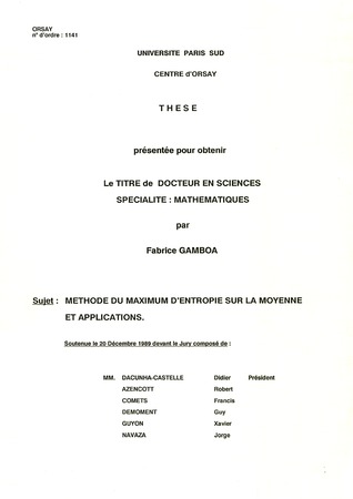 Gamboa, Fabrice. Méthode du maximum d'entropie sur la moyenne et applications. Thèses d'Orsay, no. 248 (1989), 145 p. https://www.numdam.org/item/BJHTUP11_1989__0248__P0_0/