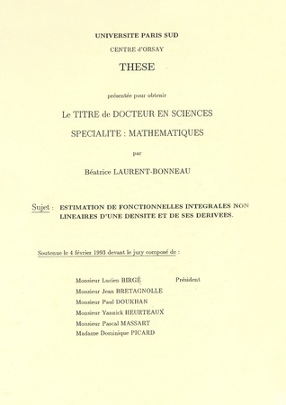 Laurent-Bonneau, Beatrice. Estimation de fonctionnelles intégrales non linéaires d'une densité et de ses dérivées. Thèses d'Orsay, no. 348 (1993), 112 p. https://www.numdam.org/item/BJHTUP11_1993__0348__P0_0/
