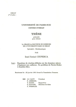 Ciuperca, Lionel. Équations de réaction-diffusion sur des domaines minces d'épaisseur non uniforme. Un problème de Navier-Stokes à frontière libre. Thèses d'Orsay, no. 406 (1995), 174 p. https://www.numdam.org/item/BJHTUP11_1995__0406__P0_0/