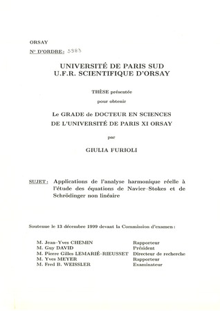 Furioli, Giulia. Applications de l'analyse harmonique réelle à l'étude des équations de Navier-Stokes et de Schrödinger non linéaire. Thèses d'Orsay, no. 547 (1999), 168 p. https://www.numdam.org/item/BJHTUP11_1999__0547__P0_0/