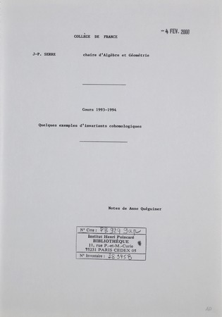 Serre, Jean-Pierre. Quelques exemples d’invariants cohomologiques. Cours de Jean-Pierre Serre, no. 15 (1993-1994), Quéguiner, Anne (red.), 178 p. https://www.numdam.org/item/CJPS_1994__15_/