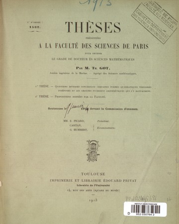 Got, Th. Questions diverses concernant certaines formes quadratiques ternaires indéfinies et les groupes fuchsiens arithmétiques qui s'y rattachent. Thèses de l'entre-deux-guerres, no. 1 (1914), 120 p. https://www.numdam.org/item/THESE_1913__1__1_0/