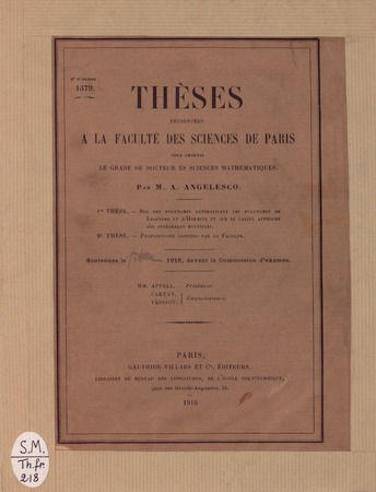 Angelesco, A. Sur des polynômes généralisant les polynômes de Legendre et d'Hermite et sur le calcul approché des intégrales multiples. Thèses de l'entre-deux-guerres, no. 11 (1916), 150 p. https://www.numdam.org/item/THESE_1916__11__1_0/