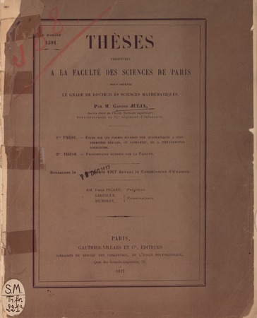 Julia, Gaston. Étude sur les formes binaires non quadratiques à indéterminées réelles, ou complexes, ou à indéterminées conjuguées. Thèses de l'entre-deux-guerres, no. 13 (1917), 300 p. https://www.numdam.org/item/THESE_1917__13__1_0/