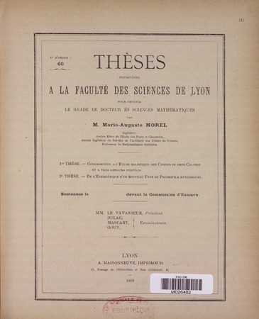 Morel, Marie-Auguste. Contribution à l'étude balistique des canons de gros calibre et à très longues portées. Thèses de l'entre-deux-guerres, no. 18 (1919), 159 p. https://www.numdam.org/item/THESE_1919__18__1_0/