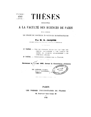Jacques, Raymond. Sur les surfaces telles que les axes des cercles osculateurs à une famille de lignes de courbure appartiennent à un complexe linéaire. Thèses de l'entre-deux-guerres, no. 30 (1922), 72 p. https://www.numdam.org/item/THESE_1922__30__1_0/