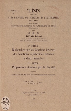 Tchao, Tsin-Yi. Recherches sur les fonctions inverses des fonctions algébroïdes entières à deux branches. Thèses de l'entre-deux-guerres, no. 85 (1928), 36 p. https://www.numdam.org/item/THESE_1928__85__3_0/