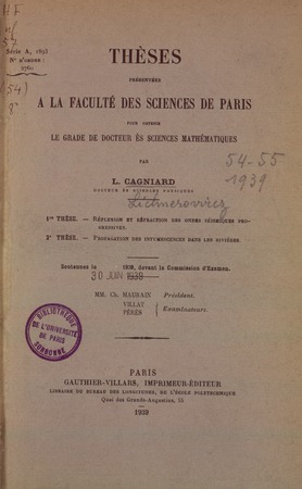 Cagniard, L. Réflexion et réfraction des ondes séismiques progressives. Thèses de l'entre-deux-guerres, no. 225 (1939), 271 p. https://www.numdam.org/item/THESE_1939__225__R1_0/