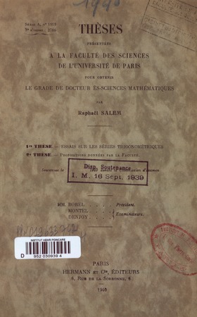 Salem, Raphaël. Essais sur les séries trigonométriques. Thèses de l'entre-deux-guerres, no. 230 (1939), 96 p. https://www.numdam.org/item/THESE_1939__230__1_0/