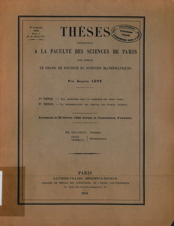 Lévy, Jacques. Les approches dans le problème des trois corps. Thèses de l'entre-deux-guerres, no. 252 (1943), 66 p. https://www.numdam.org/item/THESE_1943__252__1_0/
