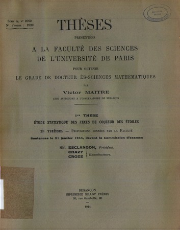 Maitre, Victor. Étude statistique des excès de couleur des étoiles. Thèses de l'entre-deux-guerres, no. 262 (1944), 108 p. https://www.numdam.org/item/THESE_1944__262__9_0/